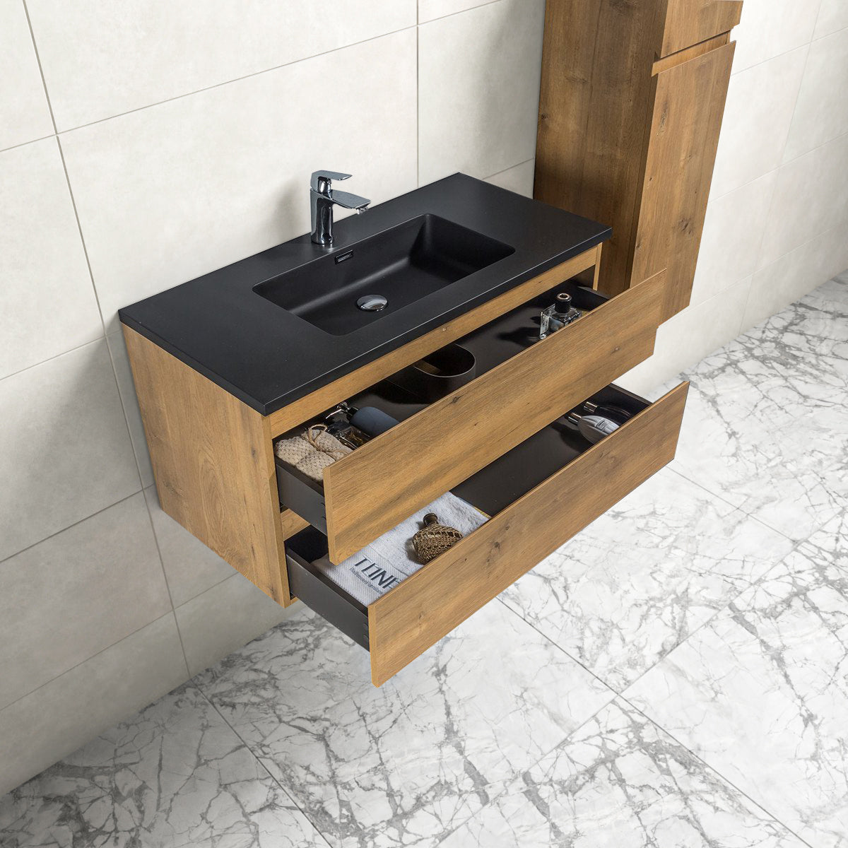 Badkamermeubel Tieme in mat eiken 100x50x48cm met zwarte wastafel