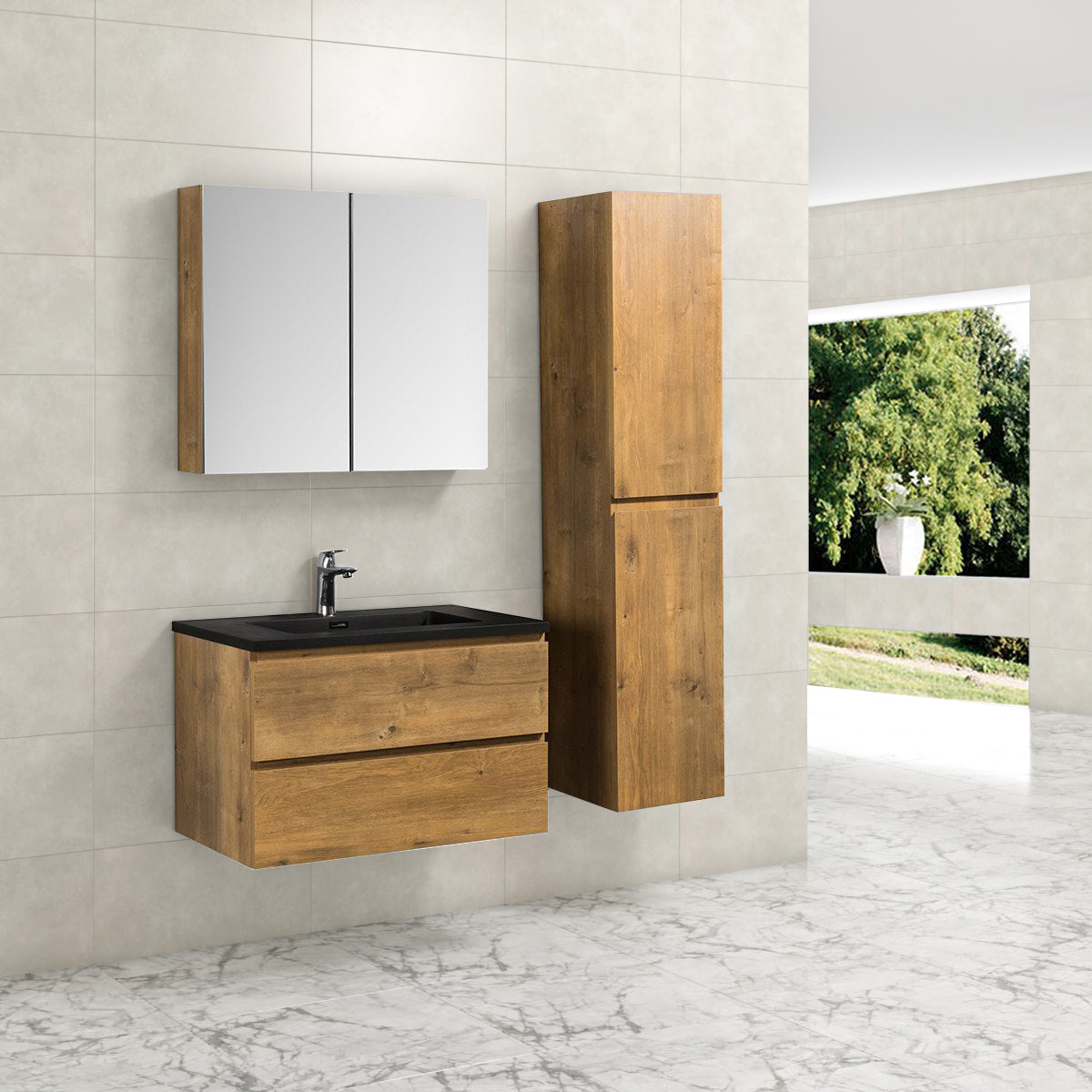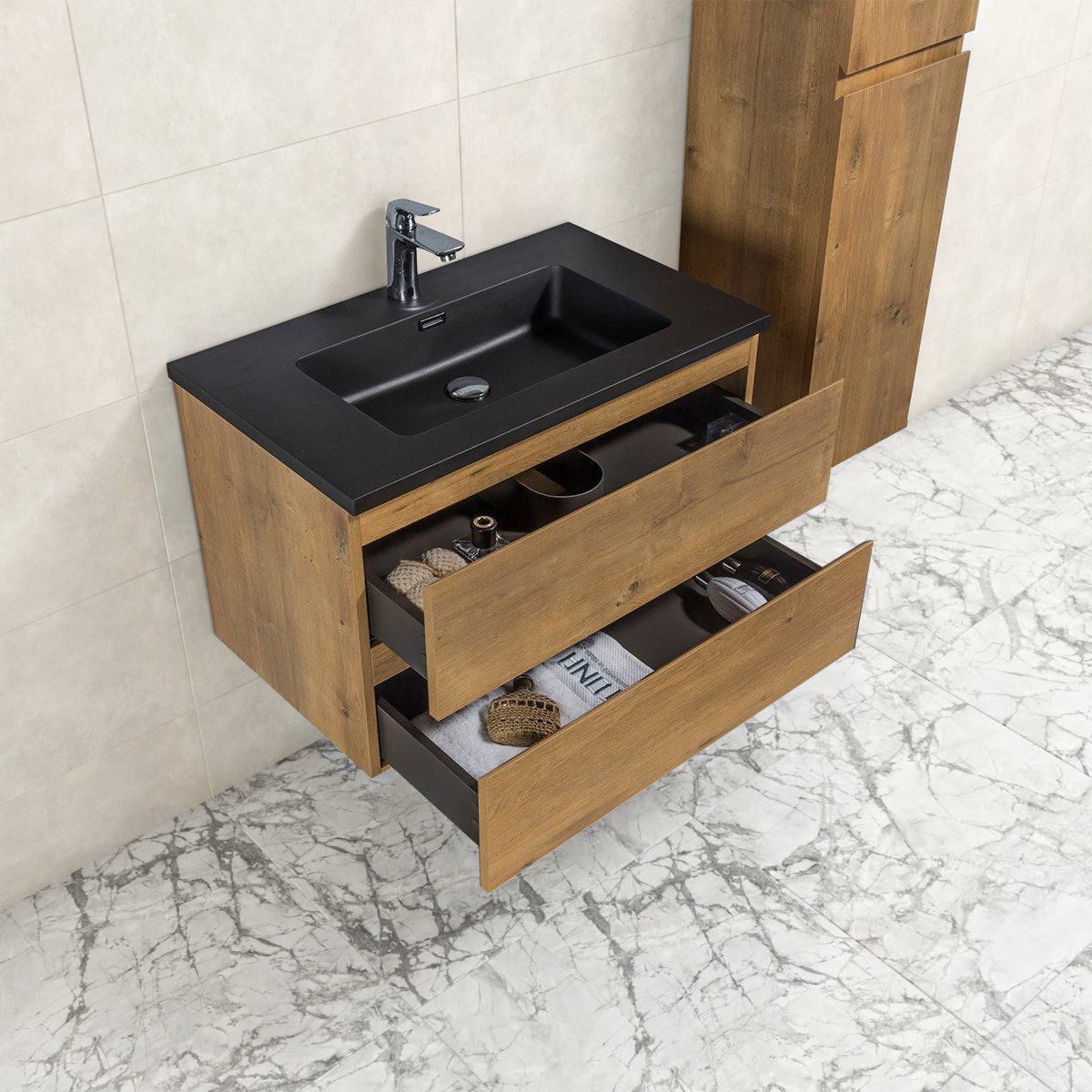 Badkamermeubel Tieme in mat eiken 80x50x48cm met zwarte wastafel.
