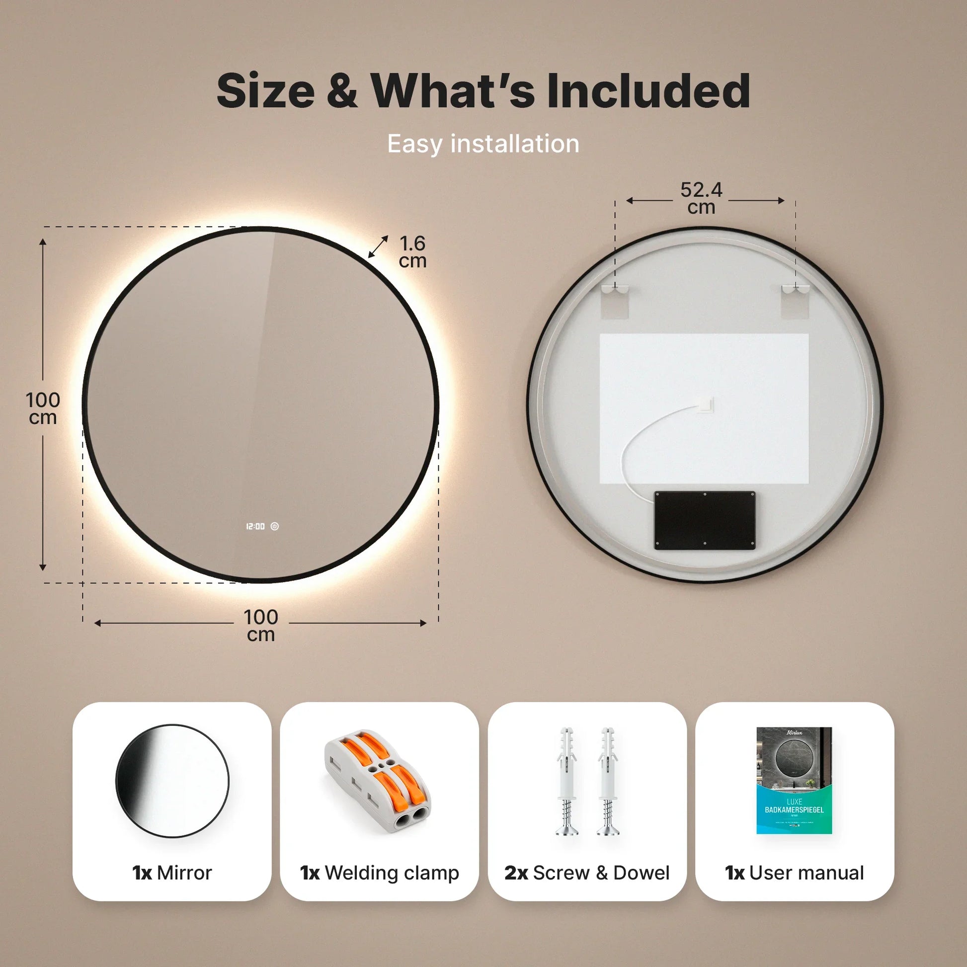 Daarnaast wordt er een lasklem meegeleverd, zodat je er ook voor kunt kiezen om de spiegel vast aan te sluiten op de stroom. Je kunt dus zelf bepalen of je de spiegel via een stopcontact gebruikt of direct op een lichtschakelaar aansluit.