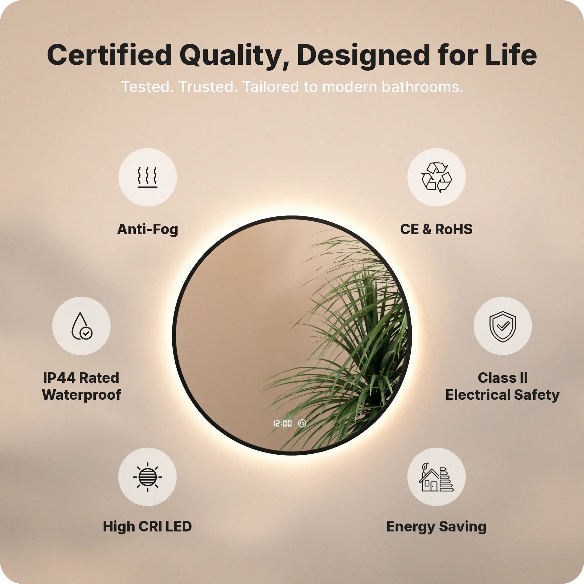 De spiegel is vervaardigd uit hoogwaardig veiligheidsglas en energiezuinige LED’s. Alle elektrische onderdelen zijn gemaakt van roestvrij en vochtbestendig materiaal en voldoen aan de geldende Europese veiligheidsnormen. Hierdoor is de spiegel geschikt voor langdurig gebruik in de badkamer en blijft hij betrouwbaar functioneren, ook in een vochtige omgeving.
