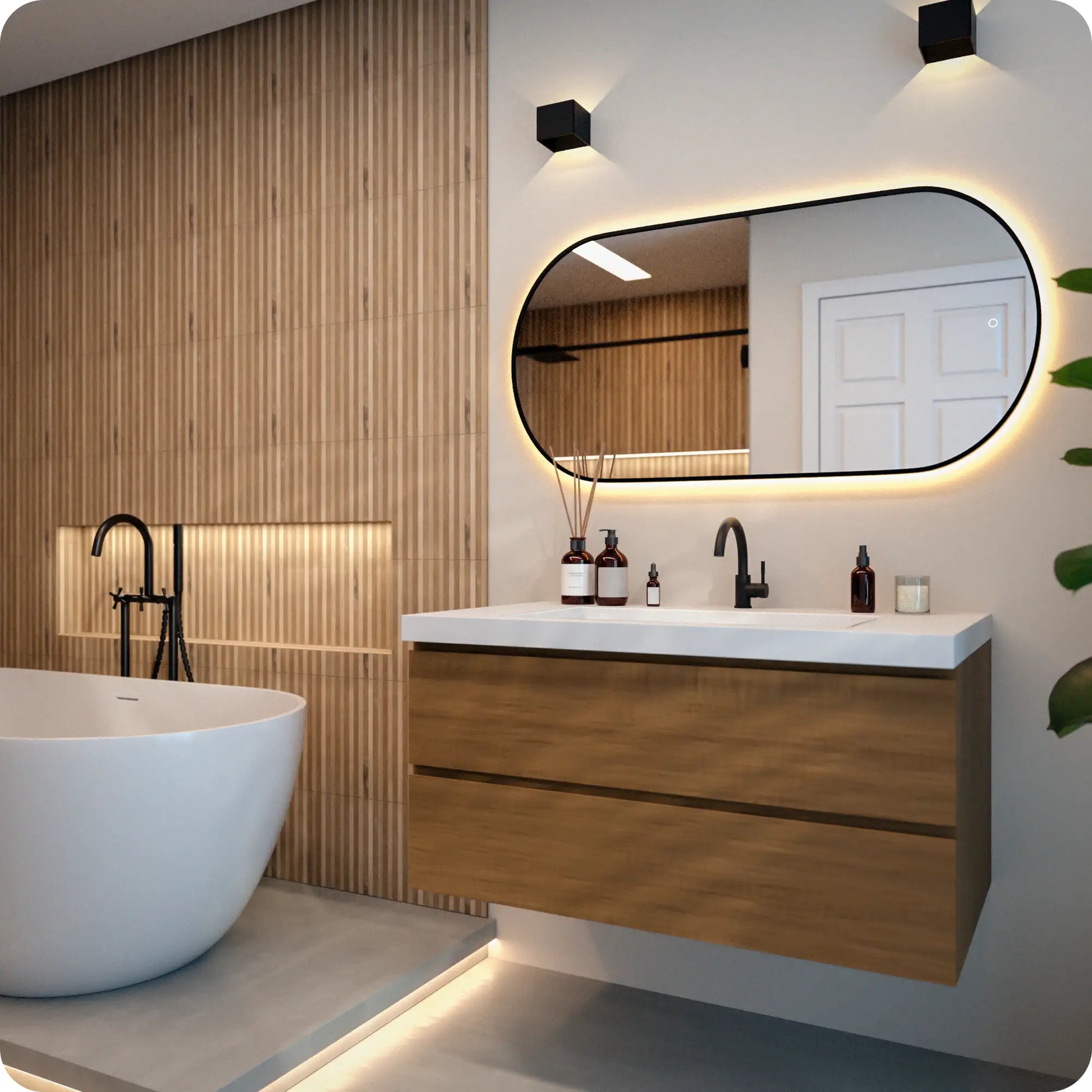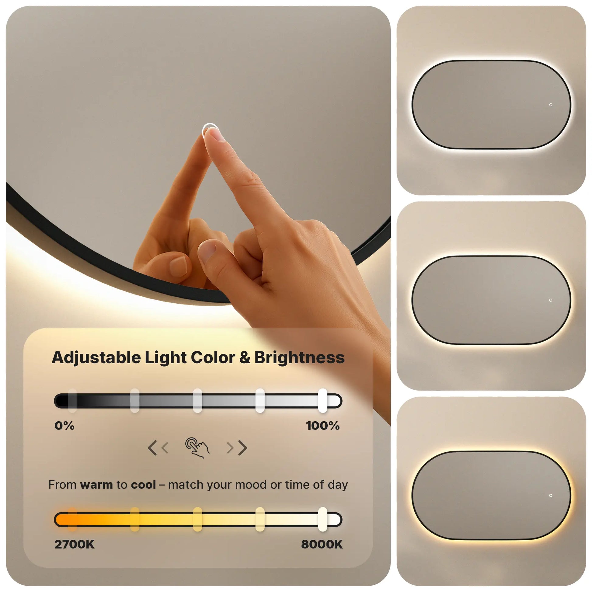 De spiegel is voorzien van dimbare LED-verlichting met meerdere lichtkleuren. Via de touchknop stel je eenvoudig de gewenste lichtsterkte en kleur in. Dankzij de geheugenfunctie onthoudt de spiegel altijd de laatst gebruikte lichtinstelling wanneer deze via de touchbediening is ingeschakeld. Zo hoef je nooit opnieuw te zoeken naar de juiste stand.