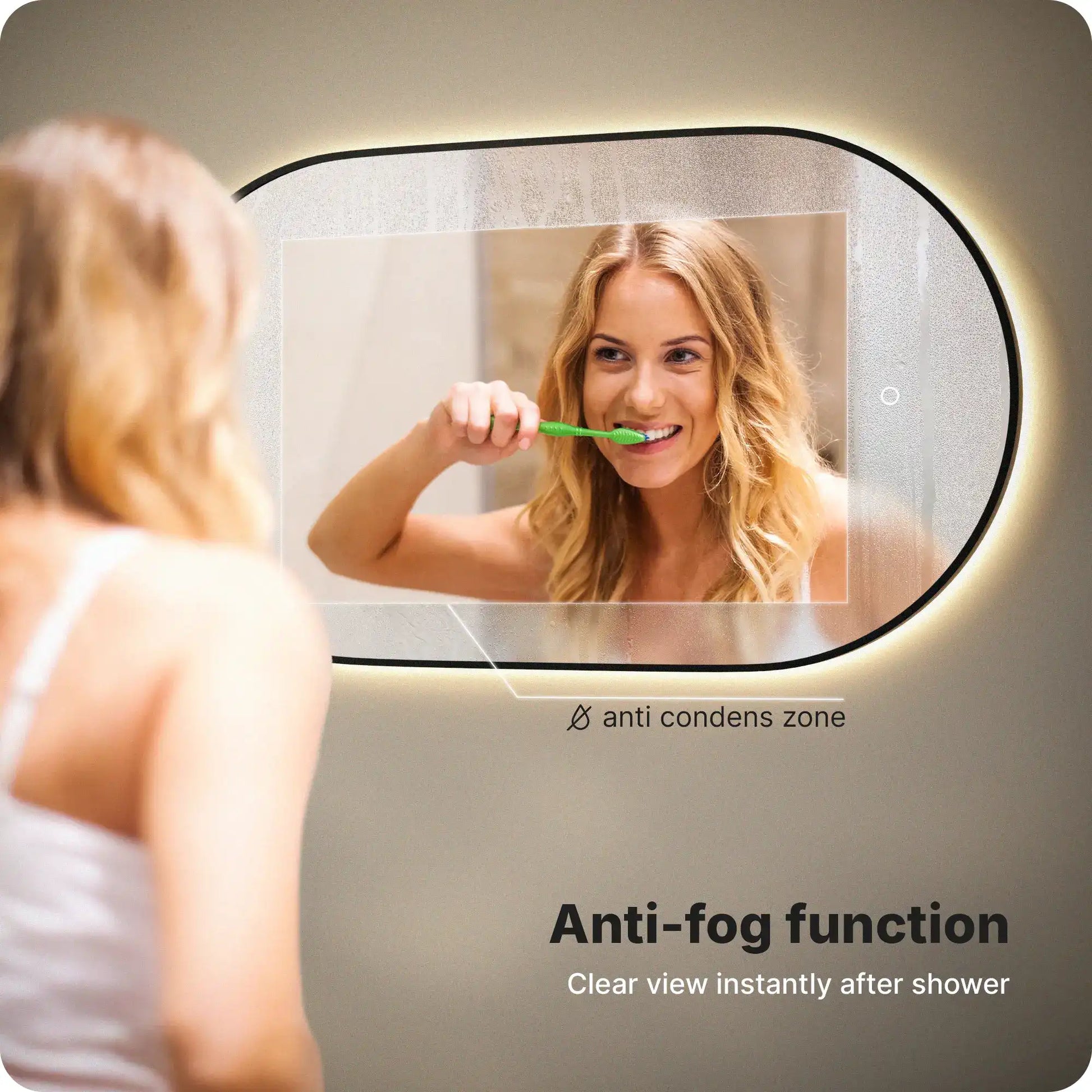 De ingebouwde anti-condens verwarmingsfolie zorgt ervoor dat de spiegel helder blijft, zelfs na een warme douche. De functie activeert automatisch wanneer je de verlichting inschakelt, waardoor je spiegel binnen enkele minuten helder en vrij van vlekken of aanslag is.