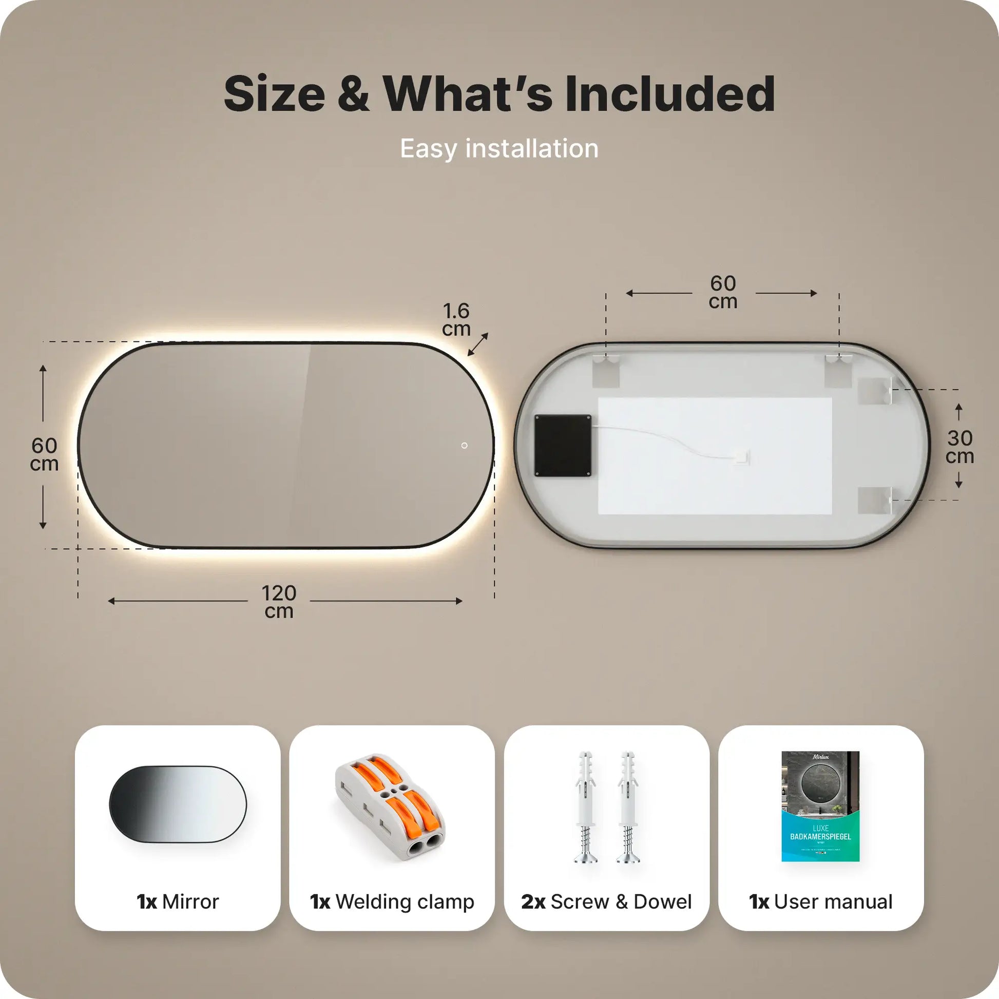 Daarnaast wordt er een lasklem meegeleverd, zodat je er ook voor kunt kiezen om de spiegel vast aan te sluiten op de stroom. Je kunt dus zelf bepalen of je de spiegel via een stopcontact gebruikt of direct op een lichtschakelaar aansluit.