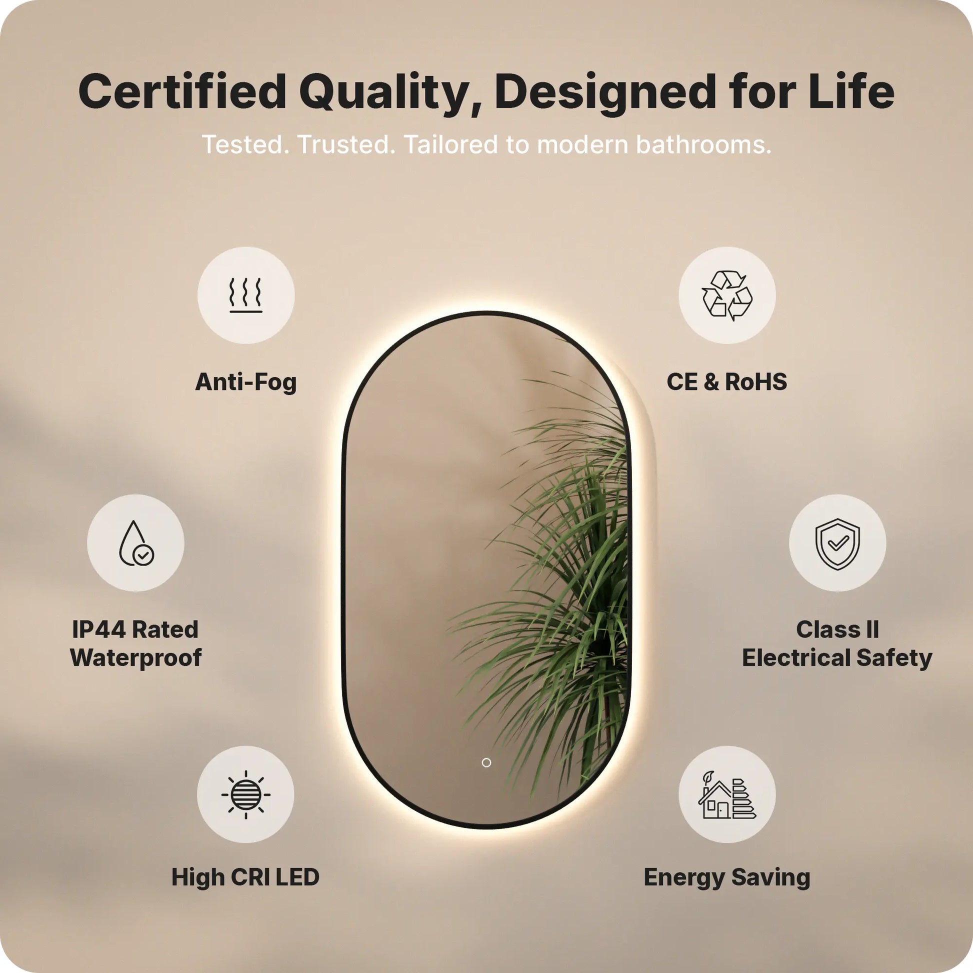 De spiegel is vervaardigd uit hoogwaardig veiligheidsglas en energiezuinige LED’s. Alle elektrische onderdelen zijn gemaakt van roestvrij en vochtbestendig materiaal en voldoen aan de geldende Europese veiligheidsnormen. Hierdoor is de spiegel geschikt voor langdurig gebruik in de badkamer en blijft hij betrouwbaar functioneren, ook in een vochtige omgeving.