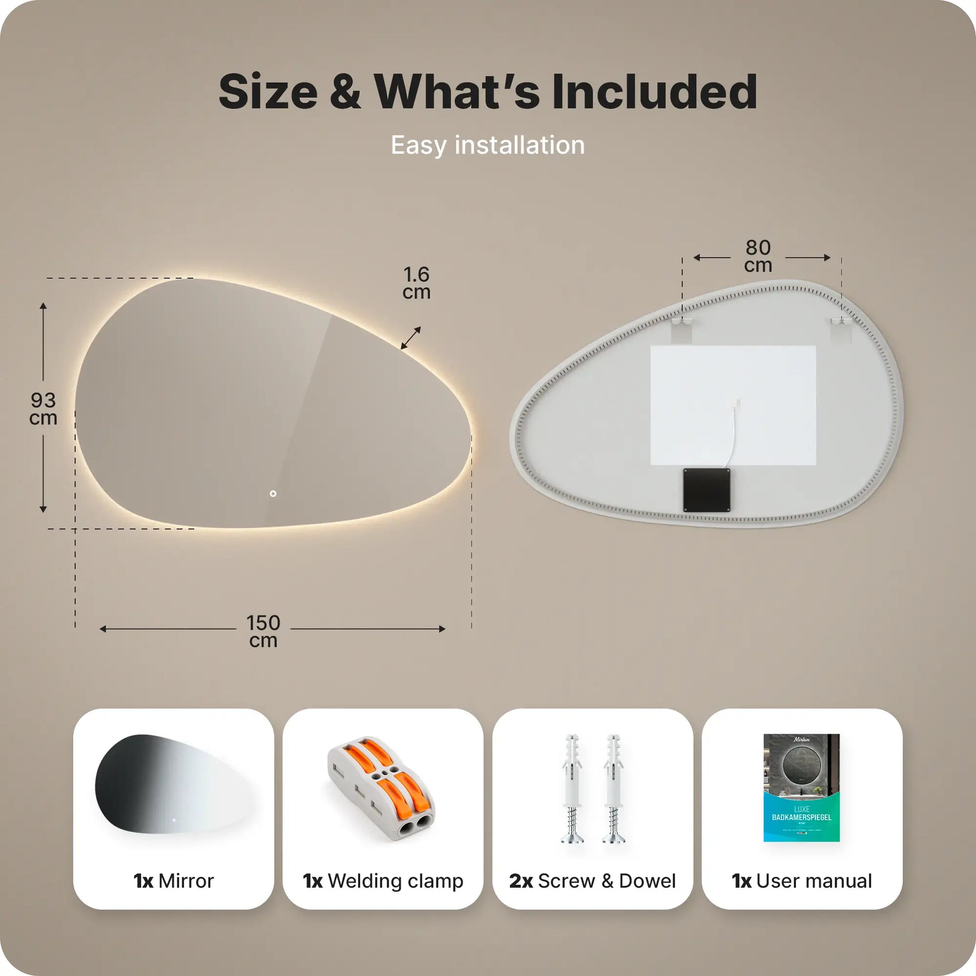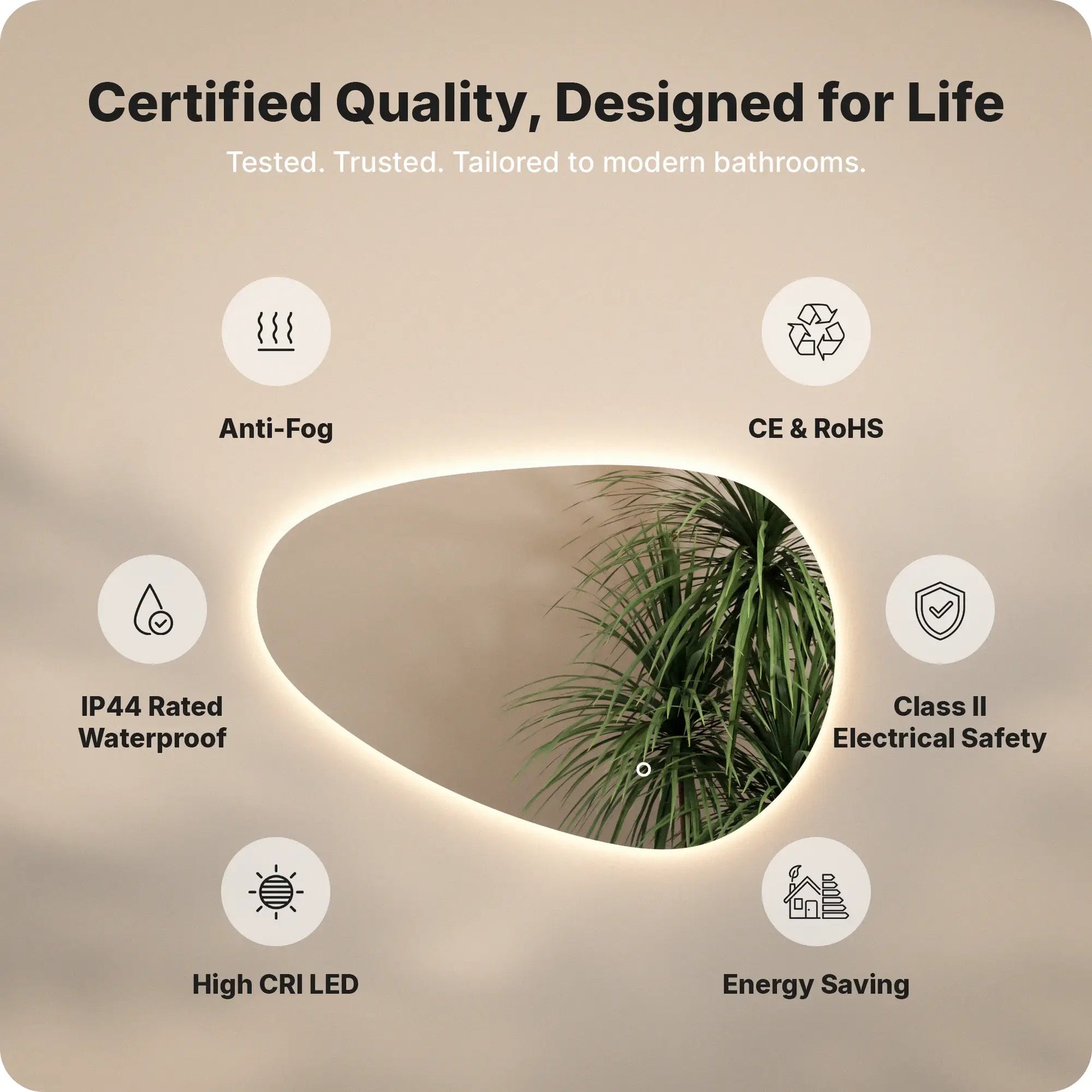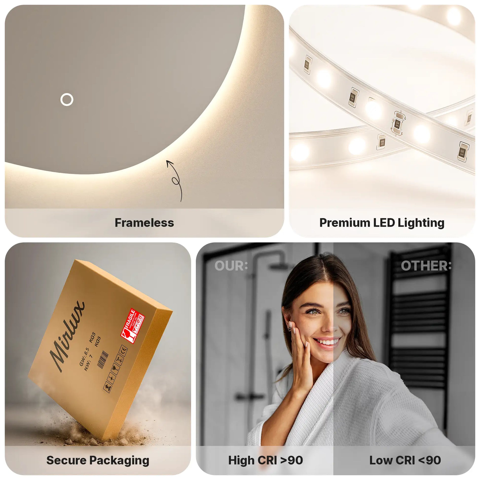 De spiegel is vervaardigd uit hoogwaardig veiligheidsglas en energiezuinige LED’s. Alle elektrische onderdelen zijn gemaakt van roestvrij en vochtbestendig materiaal en voldoen aan de geldende Europese veiligheidsnormen. Hierdoor is de spiegel geschikt voor langdurig gebruik in de badkamer en blijft hij betrouwbaar functioneren, ook in een vochtige omgeving.