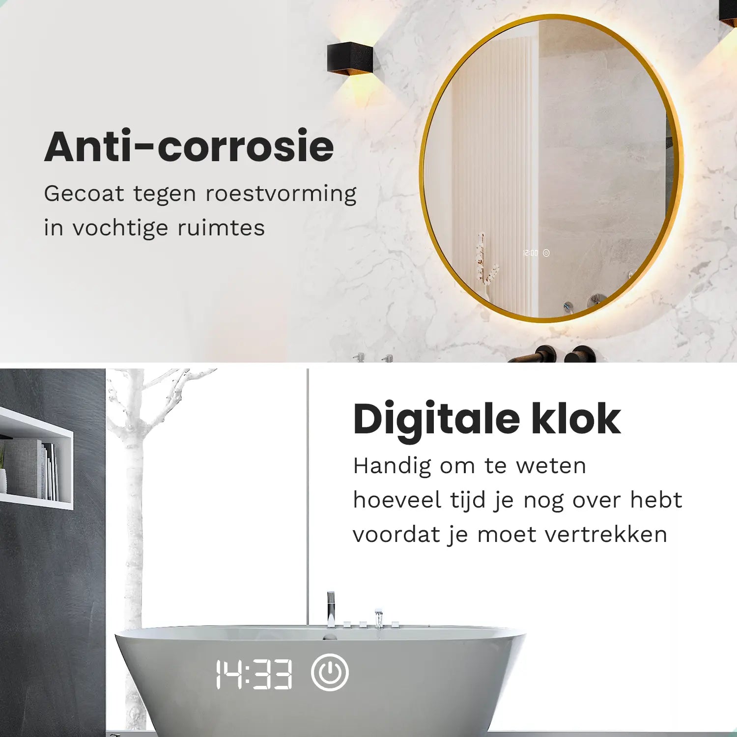 De digitale klok beschikt over een interne lithiumbatterij waardoor de tijd correct blijft lopen, ook wanneer de spiegel via de lichtschakelaar wordt uitgeschakeld. De klok hoeft niet opnieuw ingesteld te worden.