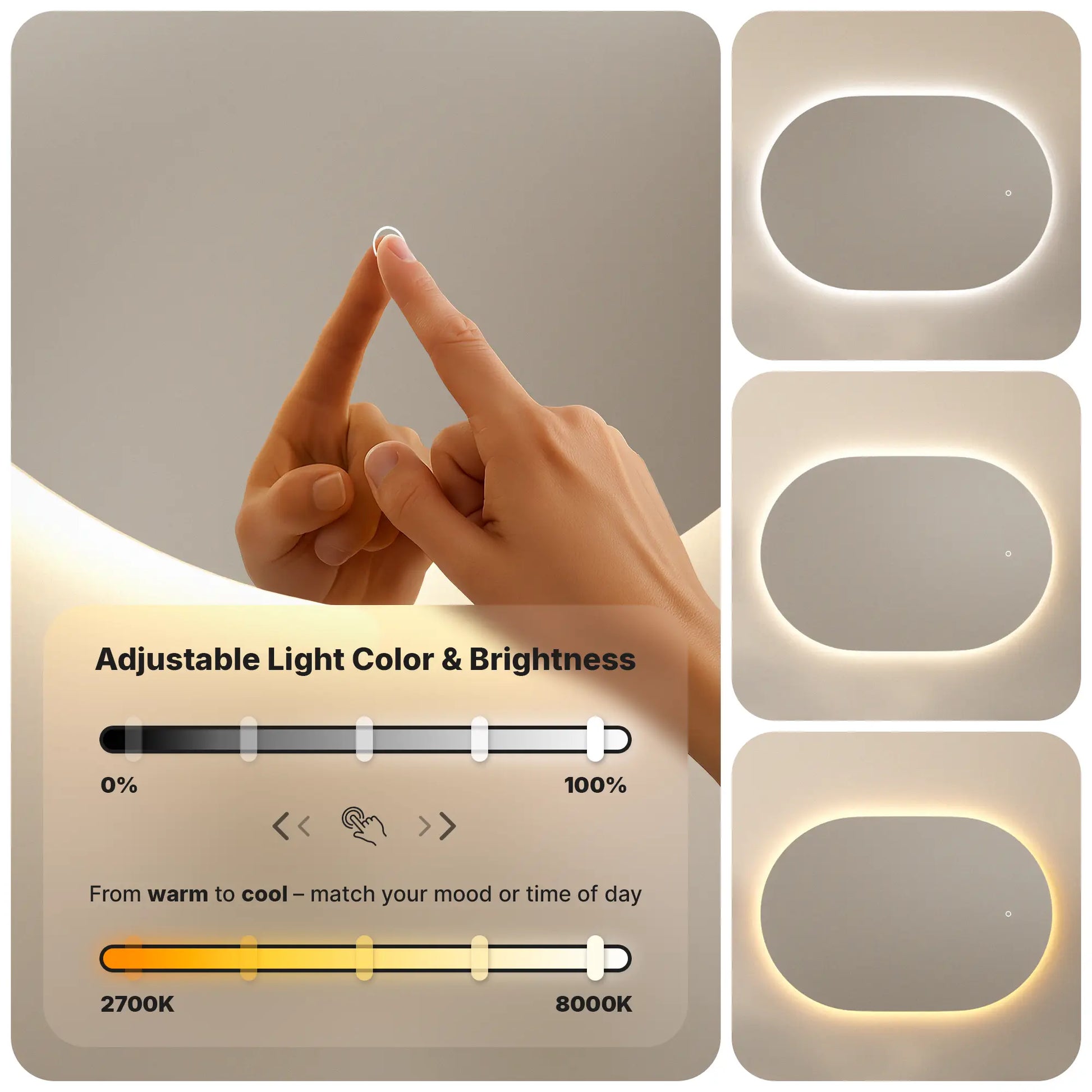De spiegel is voorzien van dimbare LED-verlichting met meerdere lichtkleuren. Via de touchknop stel je eenvoudig de gewenste lichtsterkte en kleur in. Dankzij de geheugenfunctie onthoudt de spiegel altijd de laatst gebruikte lichtinstelling wanneer deze via de touchbediening is ingeschakeld. Zo hoef je nooit opnieuw te zoeken naar de juiste stand.