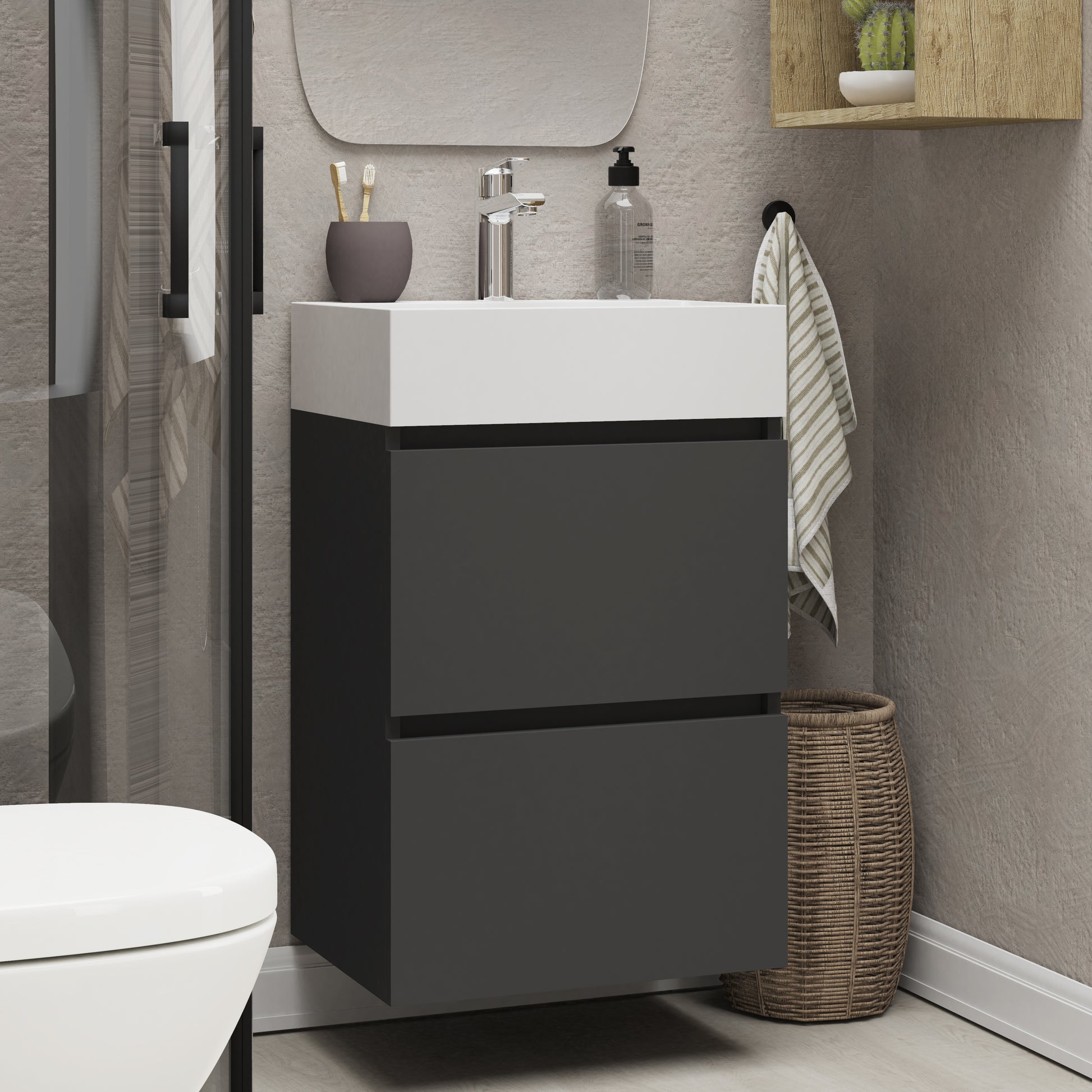 Mini onderkast met 2 laden 45 cm mat zwart en wastafel keramiek glans wit.