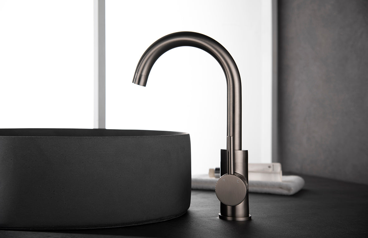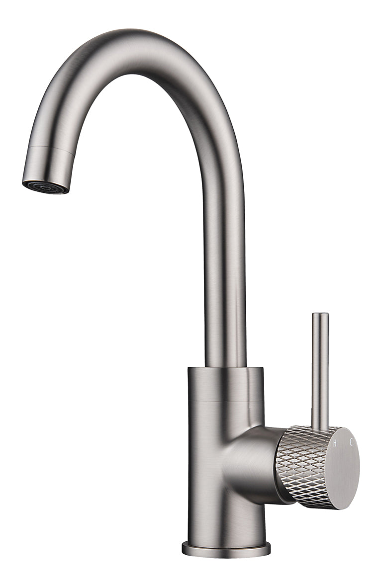 Ribbd wastafelkraan met draaibare uitloop en coldstart geborsteld staal PVD