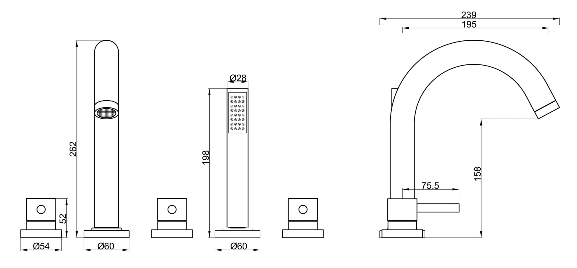 Complete badkraan met aansluitslangen, verzonken handdouche, hoge baduitloop, omstelknop