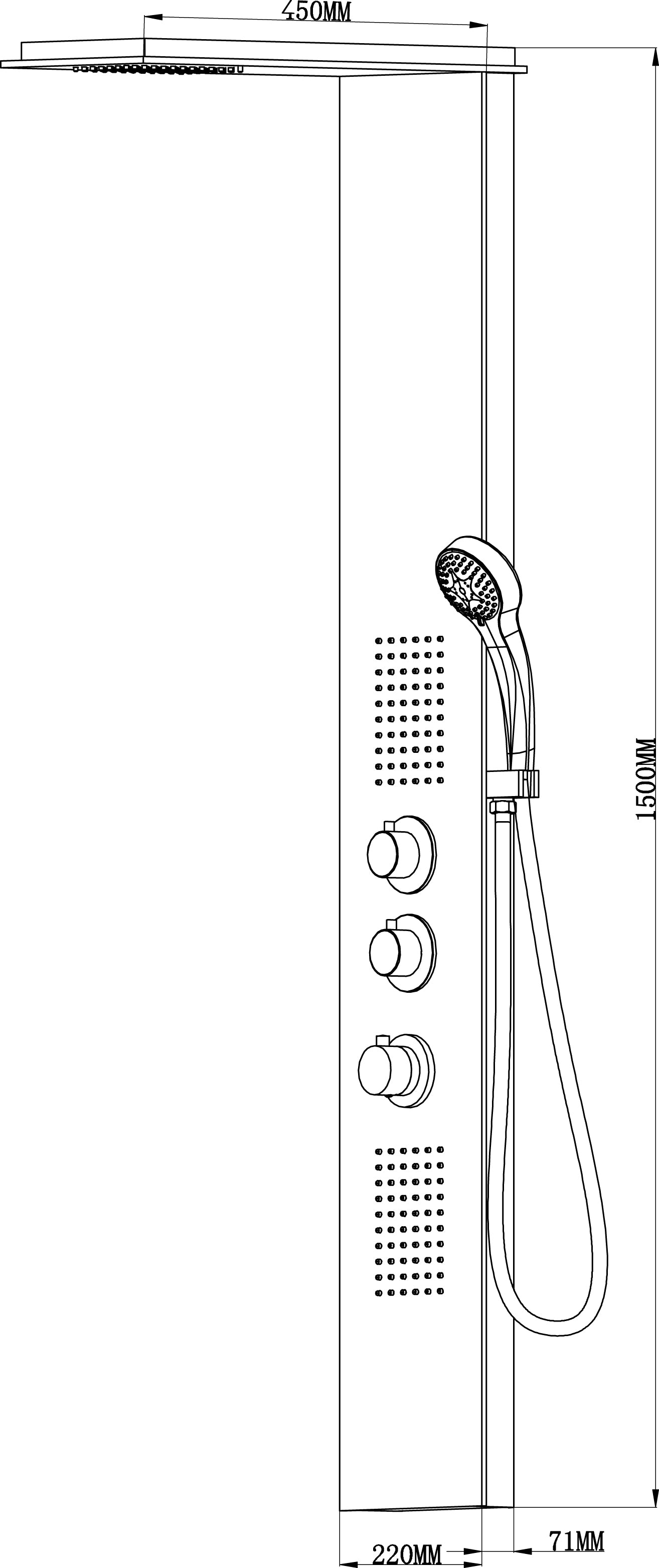 De Wiesbaden Ontario RVS douchekolom + therm.kr. 1500×220 is 150 cm hoog, 22 cm breed en heeft een voorsprong van 45 cm. Dit product wordt geleverd met een thermostatische kraan en heeft een vaste handdoucheset.
